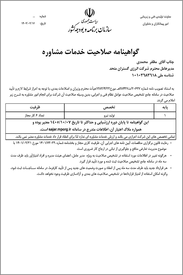 United Energy Developers Co (UED), was established in 2008 as a General Contractor in the field of Energy for execution of EPC projects in Power Generation Industries, Oil, Gas, Petrochemical and Water Industries. Thanks to its highly qualified and experienced members and staff, implementation of creative solutions and up to date management approaches, “United Energy Developers” is making efforts to establish its name as a well-known developed company both locally and internationally in the energy sector.